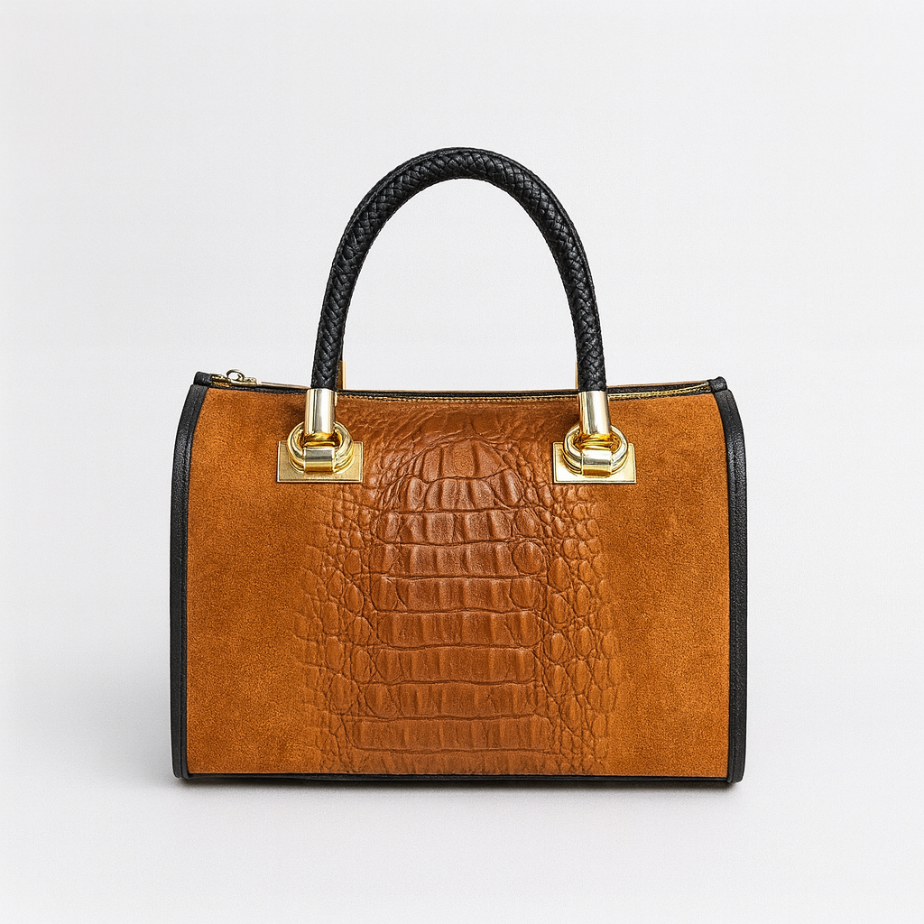 Bolso de piel serraje grabado con asas de cuero trenzado.