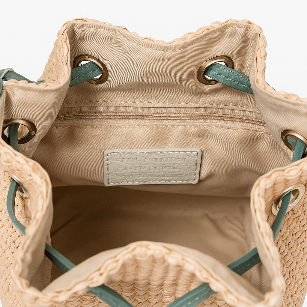 Bolso de rafia natural combinado con piel granulada. Bolsillo interior y doble posición, mano y correa para colgar en el hombro.