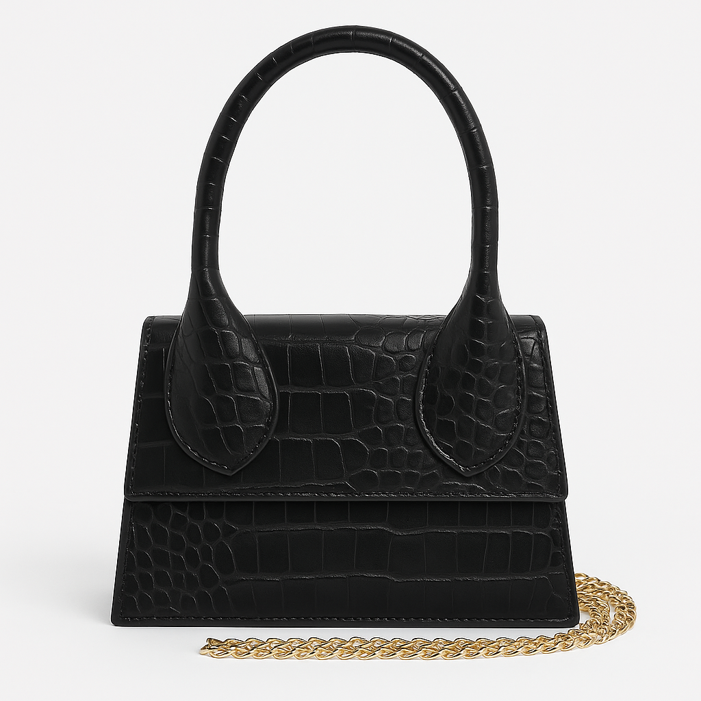 Bolso de piel grabada tipo coco con cadena dorada para llevarlo de mano o colgado del hombro. Cierre metálico de imán.